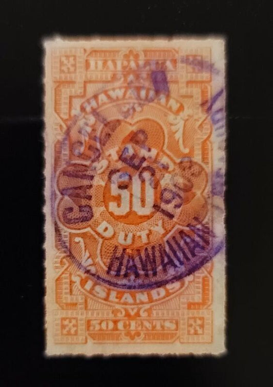 #HR2 – 1877 50c Hawaiian Islands Hapalua Tax Duty Revenue Stamp, yellow orange